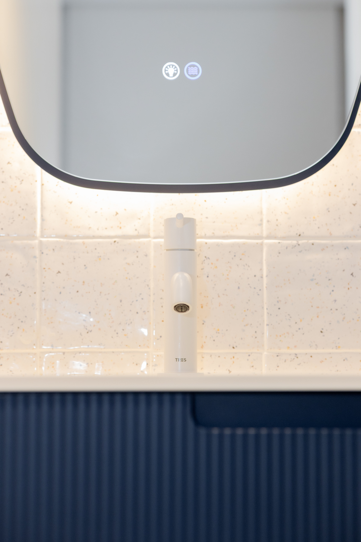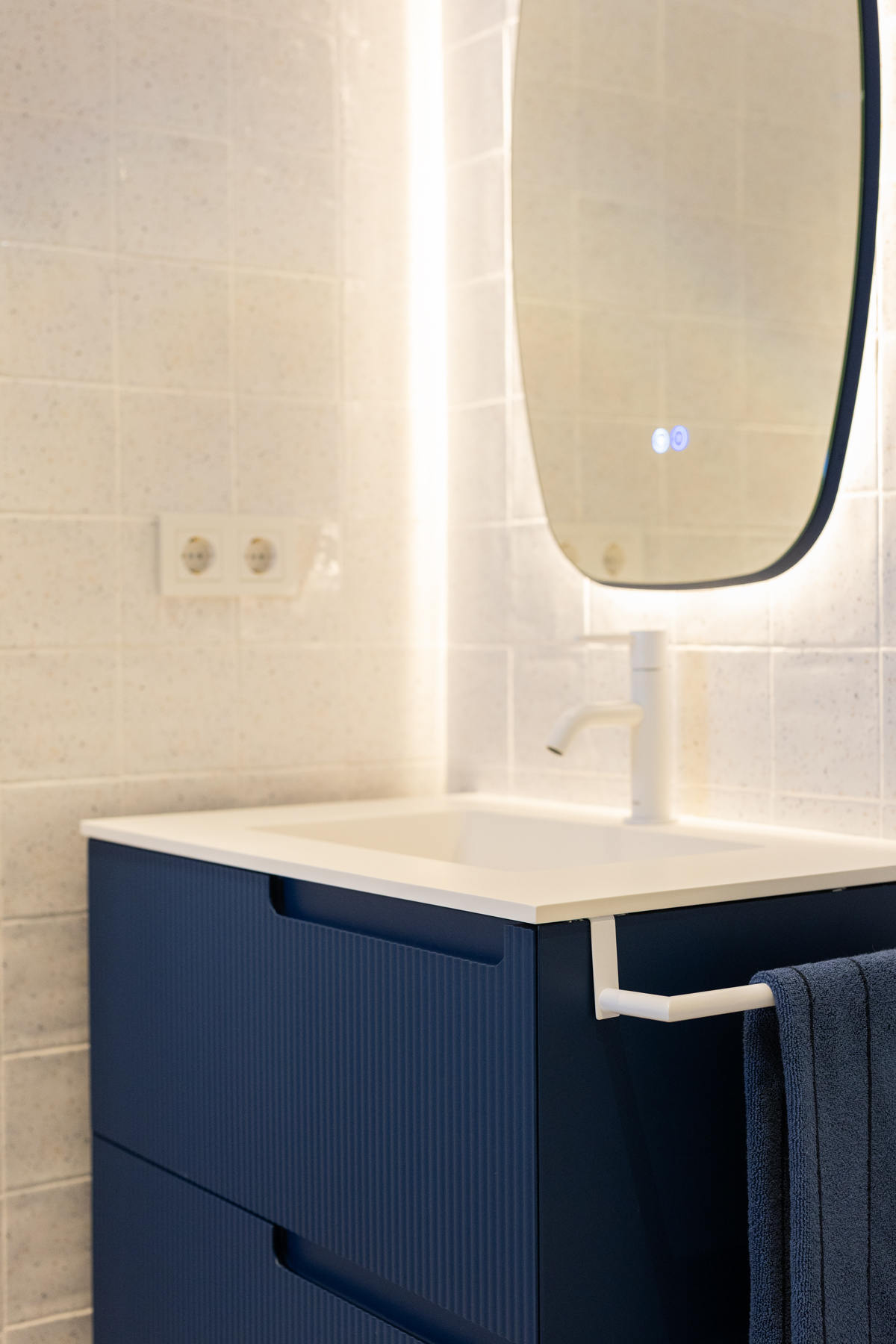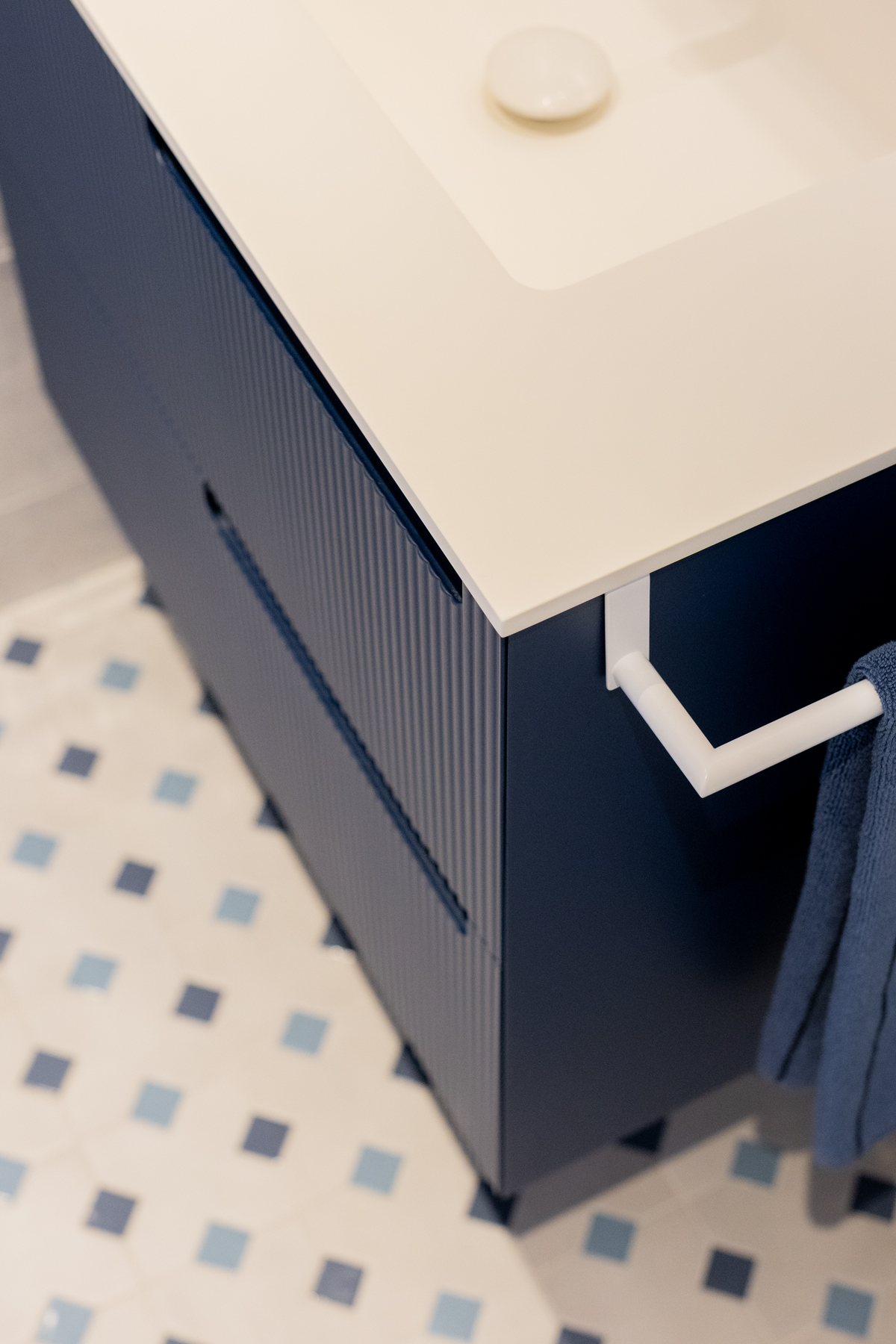 In diesem Gästebad sticht das Synergy-Möbel in der Farbe #Ultramar mit Surato-Oberfläche hervor, kombiniert mit einer weißen Waschtischplatte mit integriertem Handtuchhalter und dem Spiegel Shape – ein kompakter, funktionaler Raum voller Charakter.