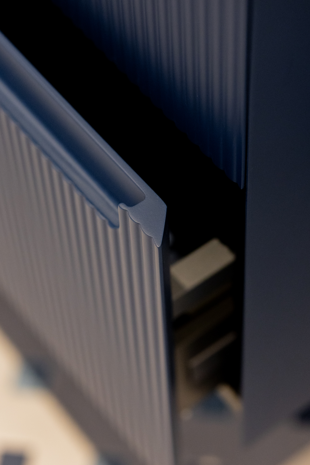 Das kleinere Kinderbad setzt auf einen klaren Kontrast zwischen Farben und Materialien – auch hier ist die Kollektion Synergy in der Farbe #ultramar und Textur Surato der Hauptakteur. Die integrierte Waschtischplatte, Wandpaneele in der Farbe #bone und die ausgewählte Keramik verleihen diesem Raum die nötige Wärme und Frische.
